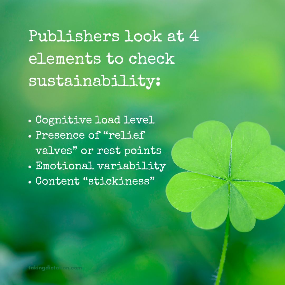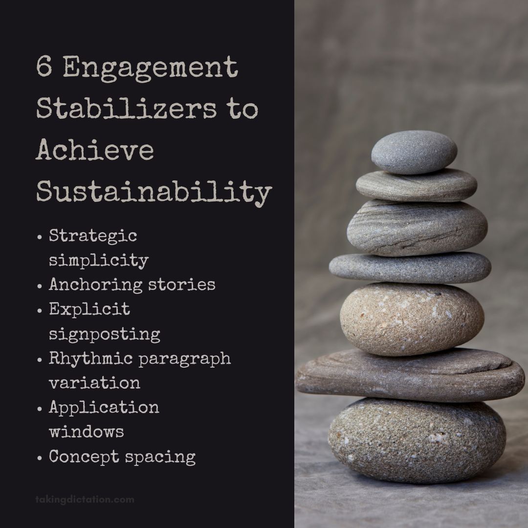When we try to answer the above questions, we can look through the manuscript for some key elements or engagement stabilizers that help readers stay with the book: